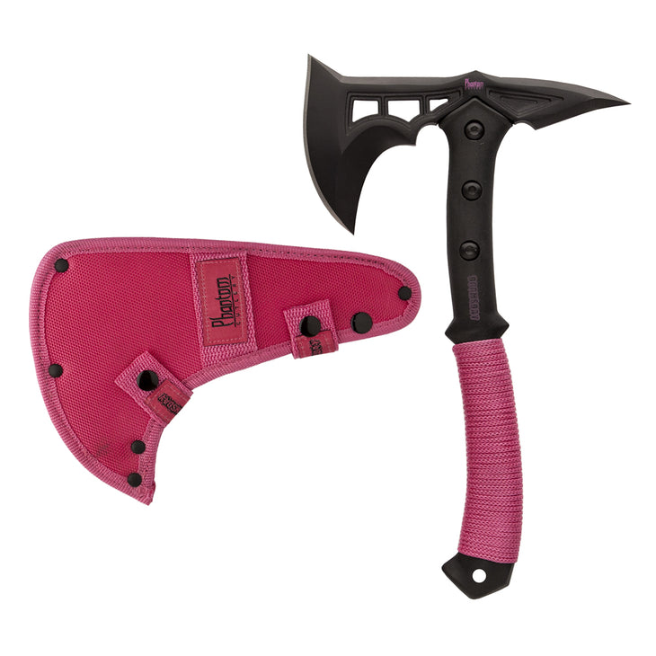 Doomsday - Tomboy Edition Axe The Fight for Survival begins now! As the inevitable apocalypse approaches, preparations need to be made. Food, Water, and of course Phantom Cutlery's new, Doomsday Axe! This Axe comes in 4 unique versions to fit any preppers' style. The Black Tactical Edition, The Toxic Green Fallout Edition, The Skull Edition and for our lady preppers, The Pink Tomboy Edition Each axe comes with its own nylon sheath custom fit for each axe.